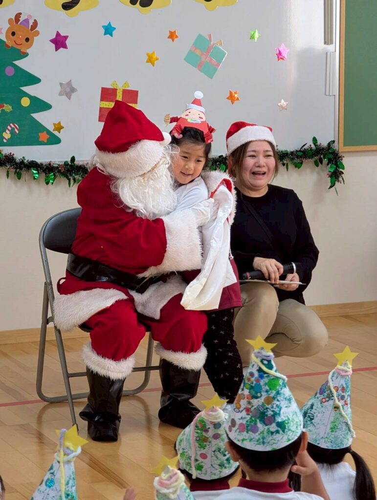 クリスマスについてのお話を聞いた後、サンタさんがホールに登場!