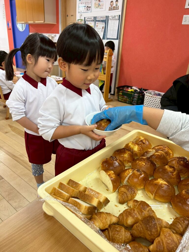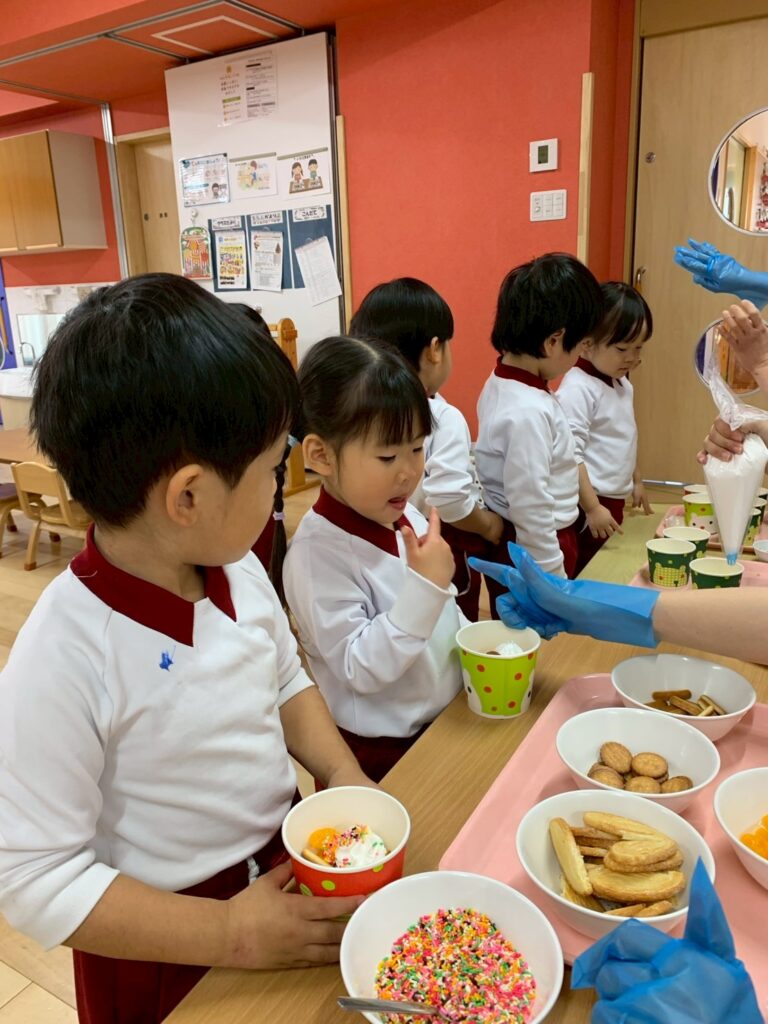 今日の給食はパンバイキング、おやつはプリンパフェ作りと子どもたちは大喜び♡