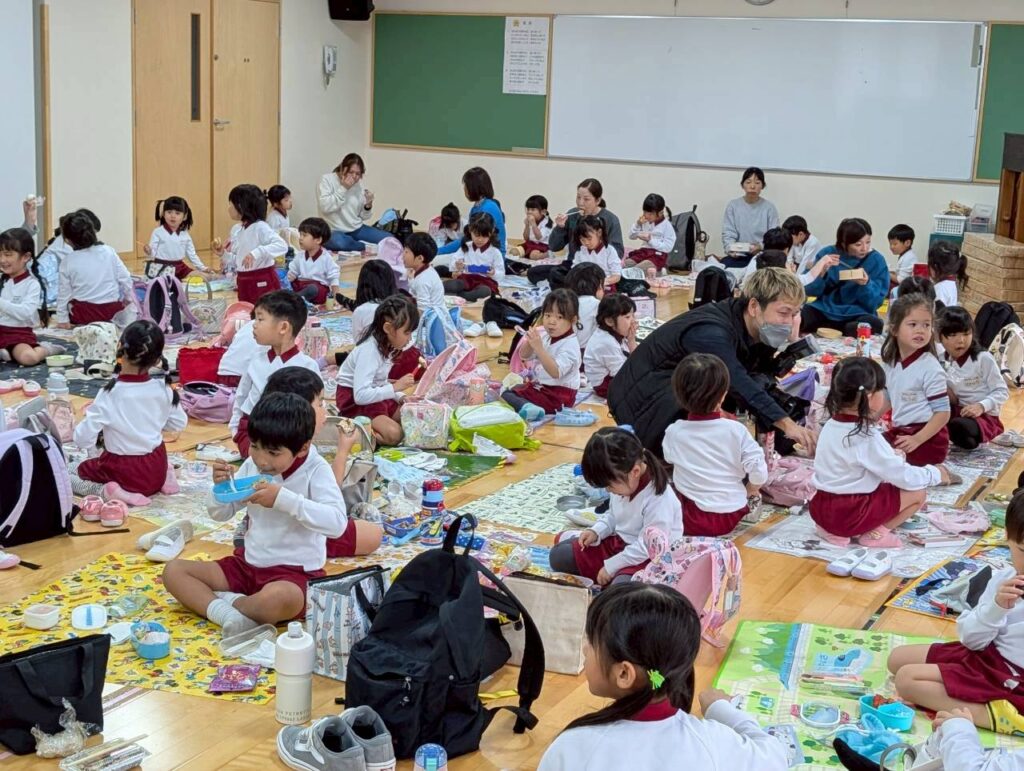 あいにく午後から雨予報だったため、お弁当は園に帰ってからみんなでホールで食べました。