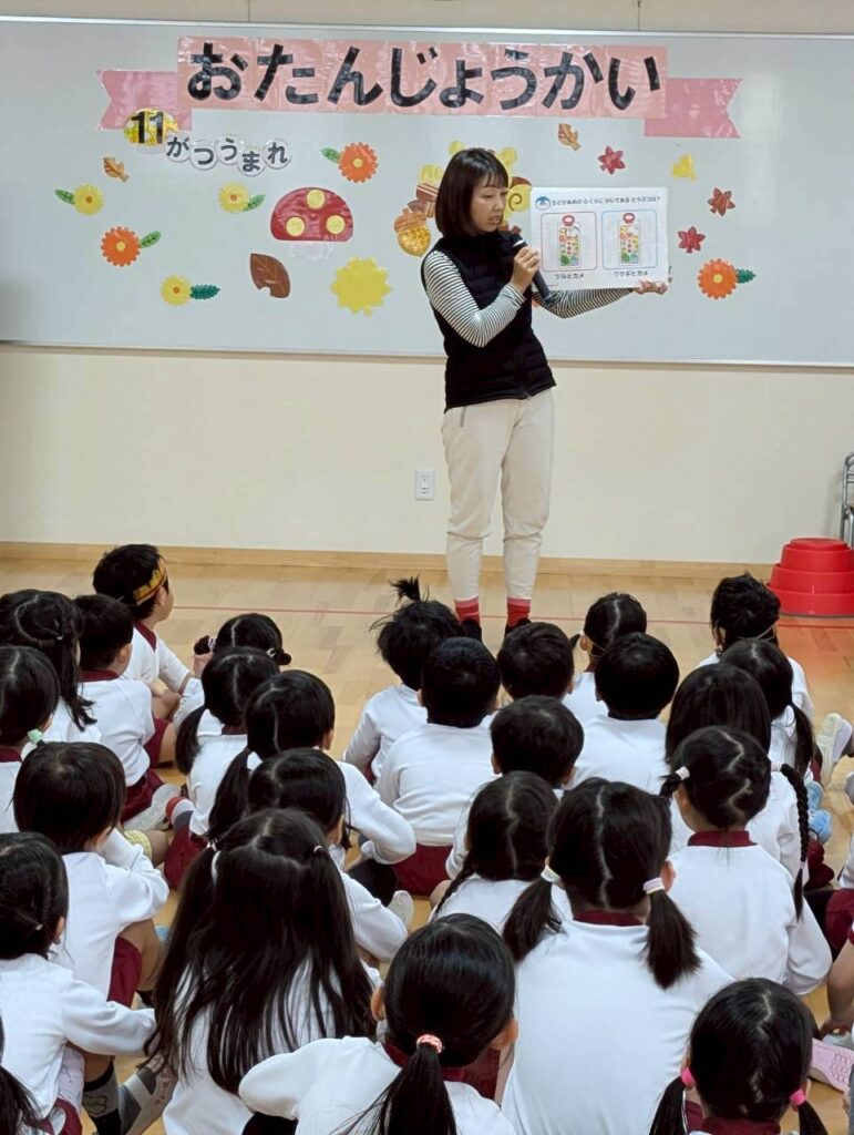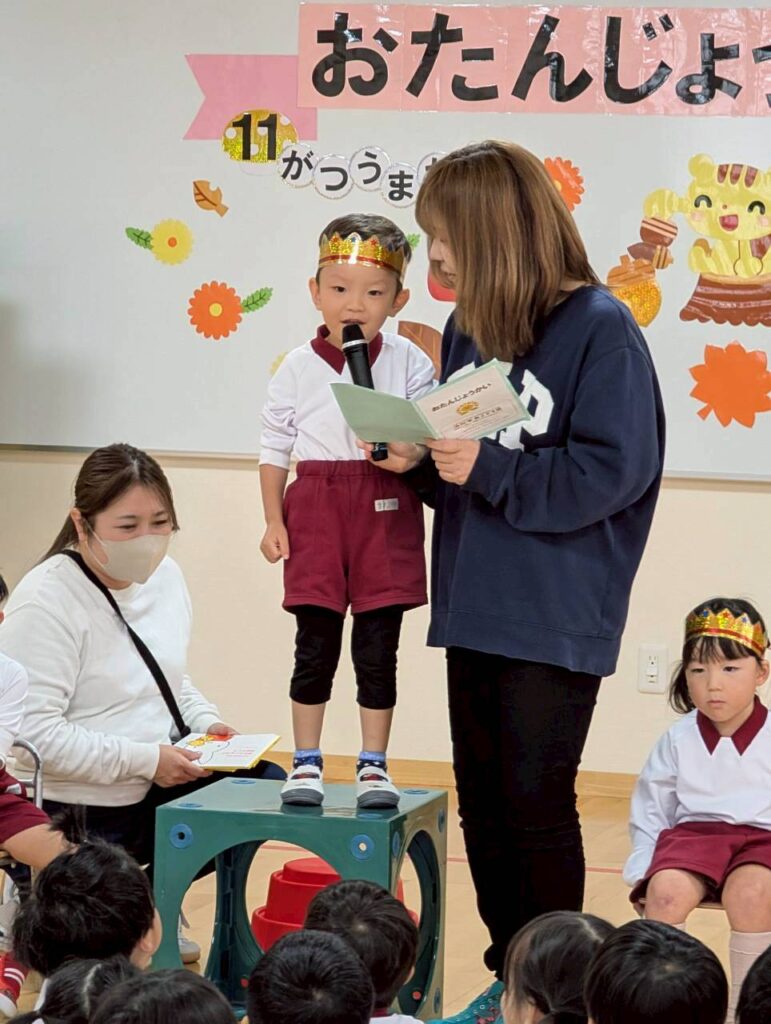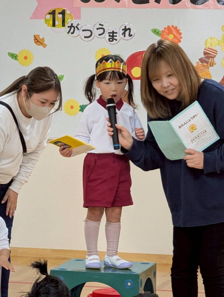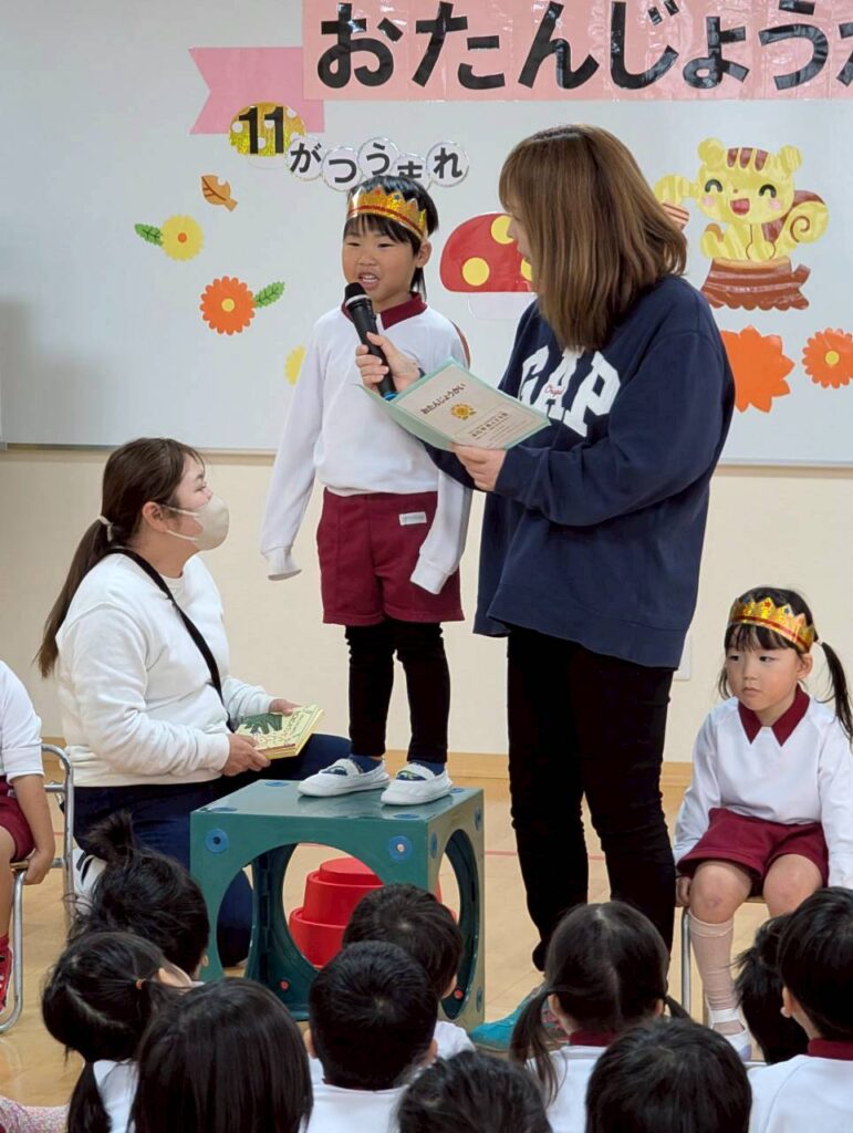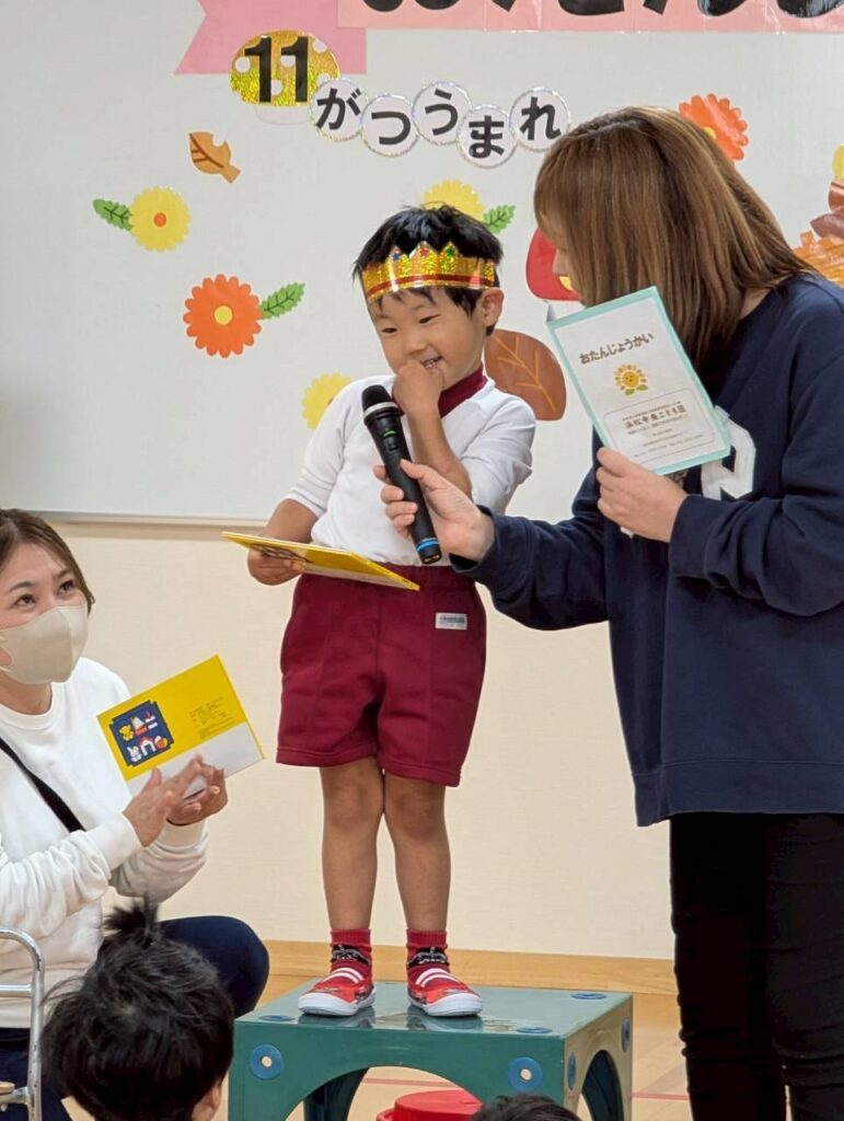 今月は年長の誕生児さんはいませんでしたが、恥ずかしそうにしながらもとても可愛らしくインタビューに答えてくれました(^^)