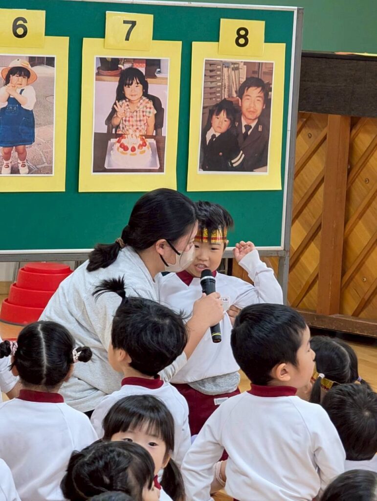先生からのプレゼントは七五三にちなんだクイズ。そして色んな先生の小さかったころの写真が登場し、どの先生かわかるかな?クイズ♡